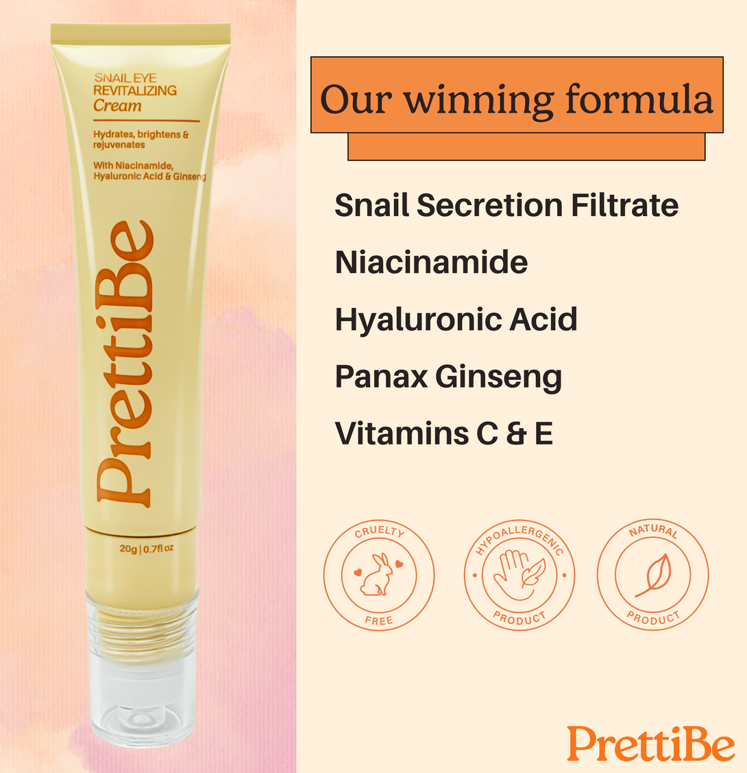 Prettibe’s Snail Eye Revitalizing Cream is a targeted treatment designed to breathe new life into tired eyes. Formulated with 96% filtrate snail mucin, this lightweight cream delivers deep hydration and skin-renewing benefits exactly where you need them most. The unique roller applicator ensures gentle, precise application—perfect for the delicate under‑eye area.